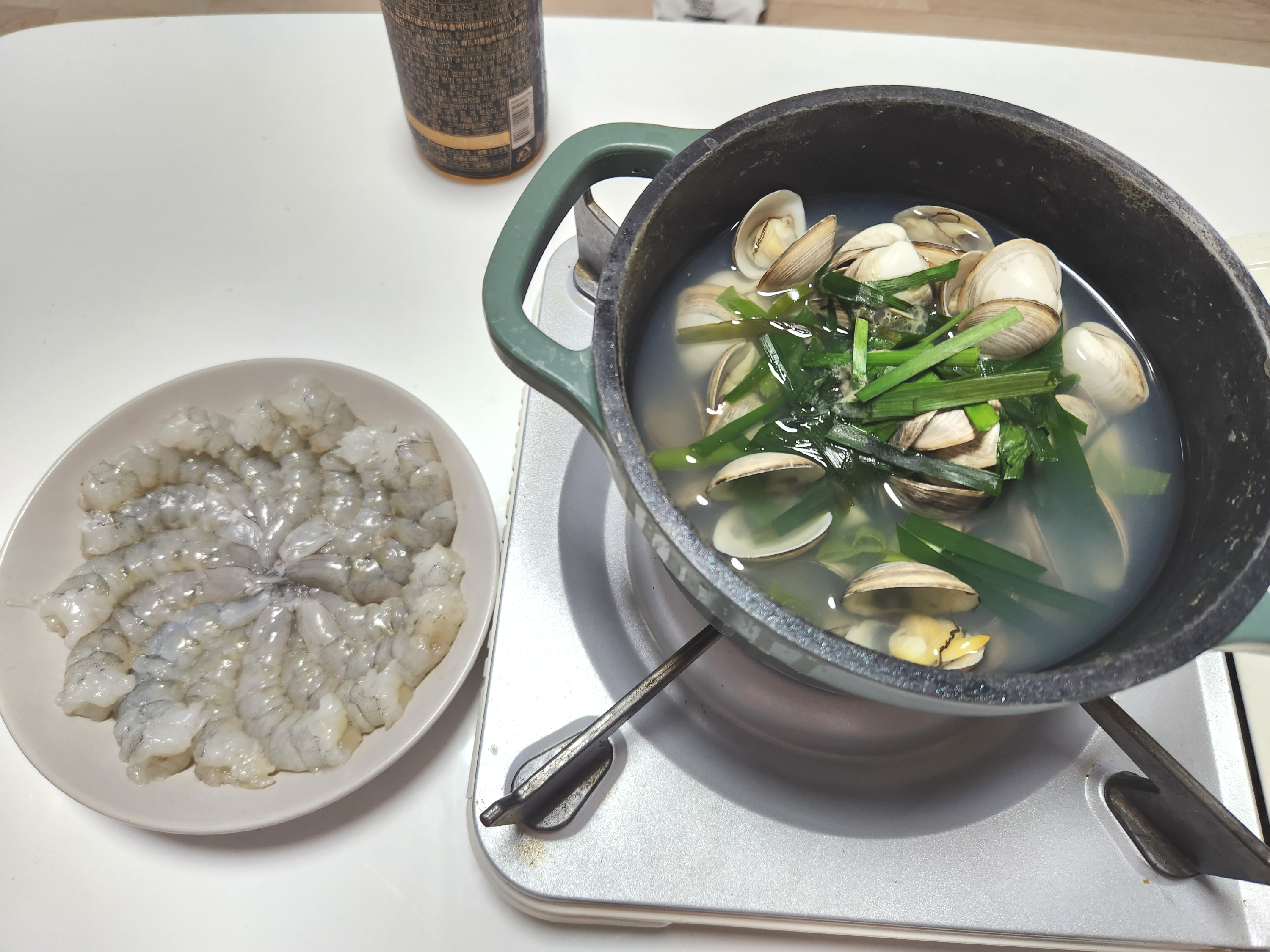 동죽에 마늘이랑 청양고추, 부추 쪼금 넣고 조개탕 해 먹었어요